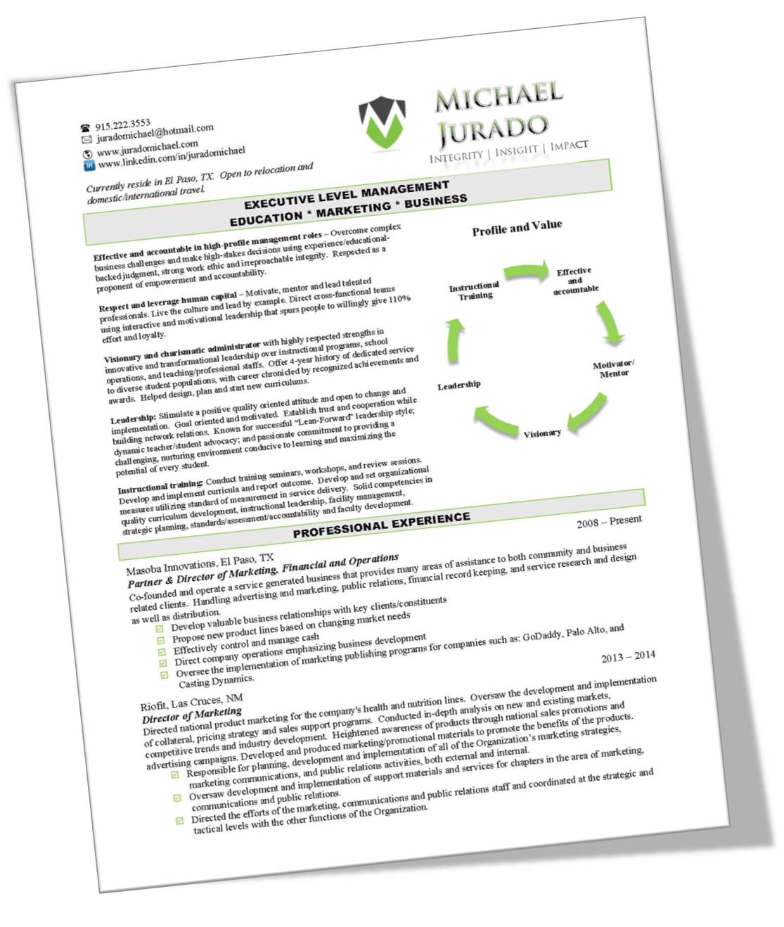 Partner & Director of Marketing, Financial and Operations | Masoba Innovations | 2008 - PresentCo-founded and operate a service generated business that provides many areas of assistance to both community and business related clients. Handling advertising and marketing, public relations, financial record keeping, and service research and design as well as distribution. Director of Marketing | Riofit | 2013 - 2014Directed national product marketing for the company's health and nutrition lines. Oversaw the development and implementation of collateral, pricing strategy and sales support programs. Conducted in-depth analysis on new and existing markets, competitive trends and industry development. Heightened awareness of products through national sales promotions and advertising campaigns. Developed and produced marketing/promotional materials to promote the benefits of the products. Key Holder/Assistant Store Manager | Radioshack | 2010 - 2013Merchandised the store and developed unique presentations. Oversaw staff of three sales associates, maintaining schedules, performing evaluations, and conducting training sessions. Accountable for stores' overall look and driving store sales in addition to managing in-store visual merchandising. Academic Dean | International Business College | 2004 - 2008Personally recruited by Vice-President of IBC and West Campus Director to provide strategic and administrative leadership over all aspects of curriculum and faculty development; recruitment, retention, development, supervision and evaluation of 20 instructors; development of curricula and instructional materials. Responsible for being a facilitator and communicator between the Director and the Faculty. Assist the Director with functions related to the educational realm, specifically with curriculum development and maintaining timely and updated information package preparation to the Texas Workforce Commission, the Accrediting Council for Independent Colleges and Schools, and any other organizations that require updates. Responsible for Program/Catalog Revisions, New Curriculum Development, Annual updates and internal reports. Other position held: Instructor (2004 to 2005) A detailed career history and selected contributions can be found on Michael's Resume. |